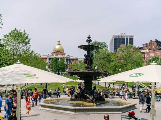 The plaza and park surrounding the fully restored Brewer Fountain were transformed into one of Boston’s most memorable places. New trees line Liberty Mall and frame an iconic view of the Massachusetts State House with its gold dome. A circular granite plaza with benches, tables, and movable chairs surrounds the fountain, providing places where people can eat lunch, play chess, read books from the mobile cart, or listen to live piano music. What was first thought of as a simple restoration project became a major place-making opportunity.